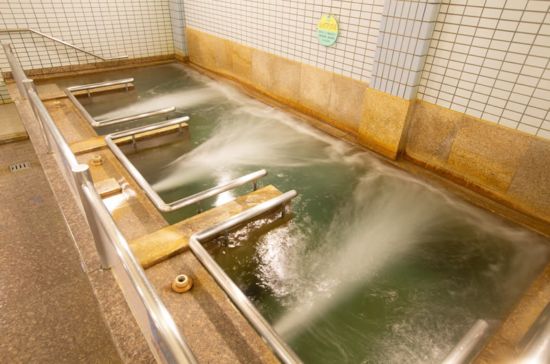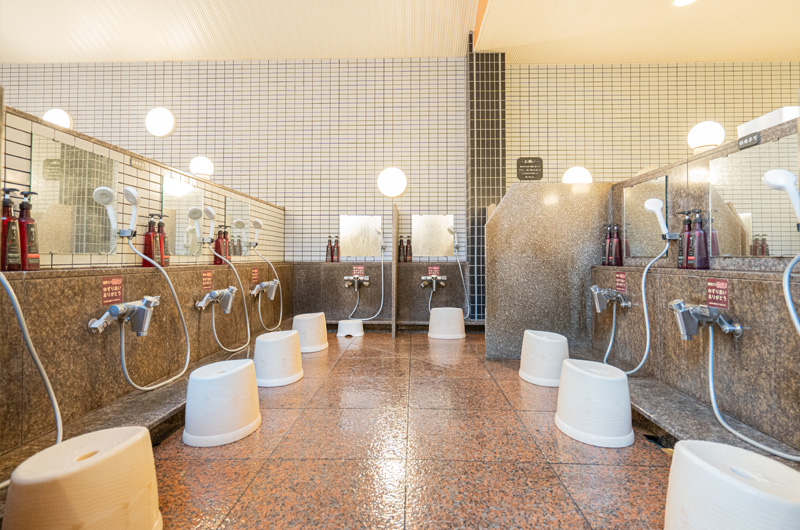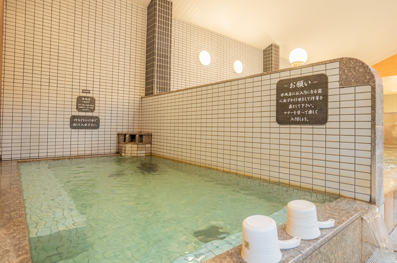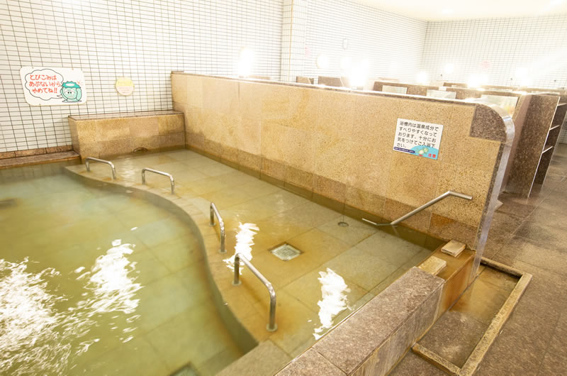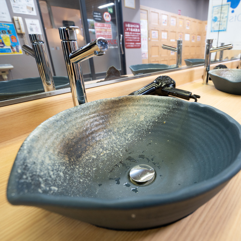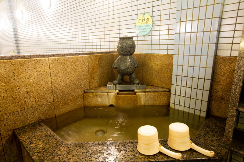 ご入浴の前にかけ湯をどうぞ。 ゆららイメージキャラクターの かっぱがお出迎えいたします。