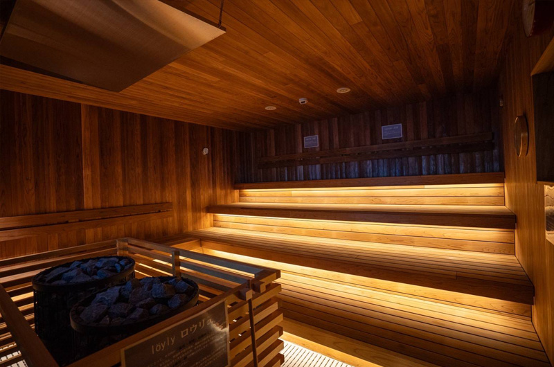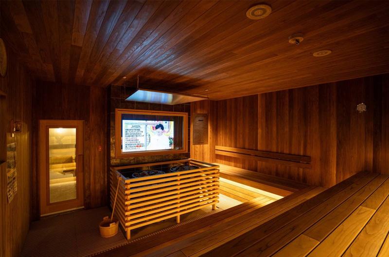 80℃~90℃のフィンランド式セルフロウリュサウナです。最大25名入室可能。